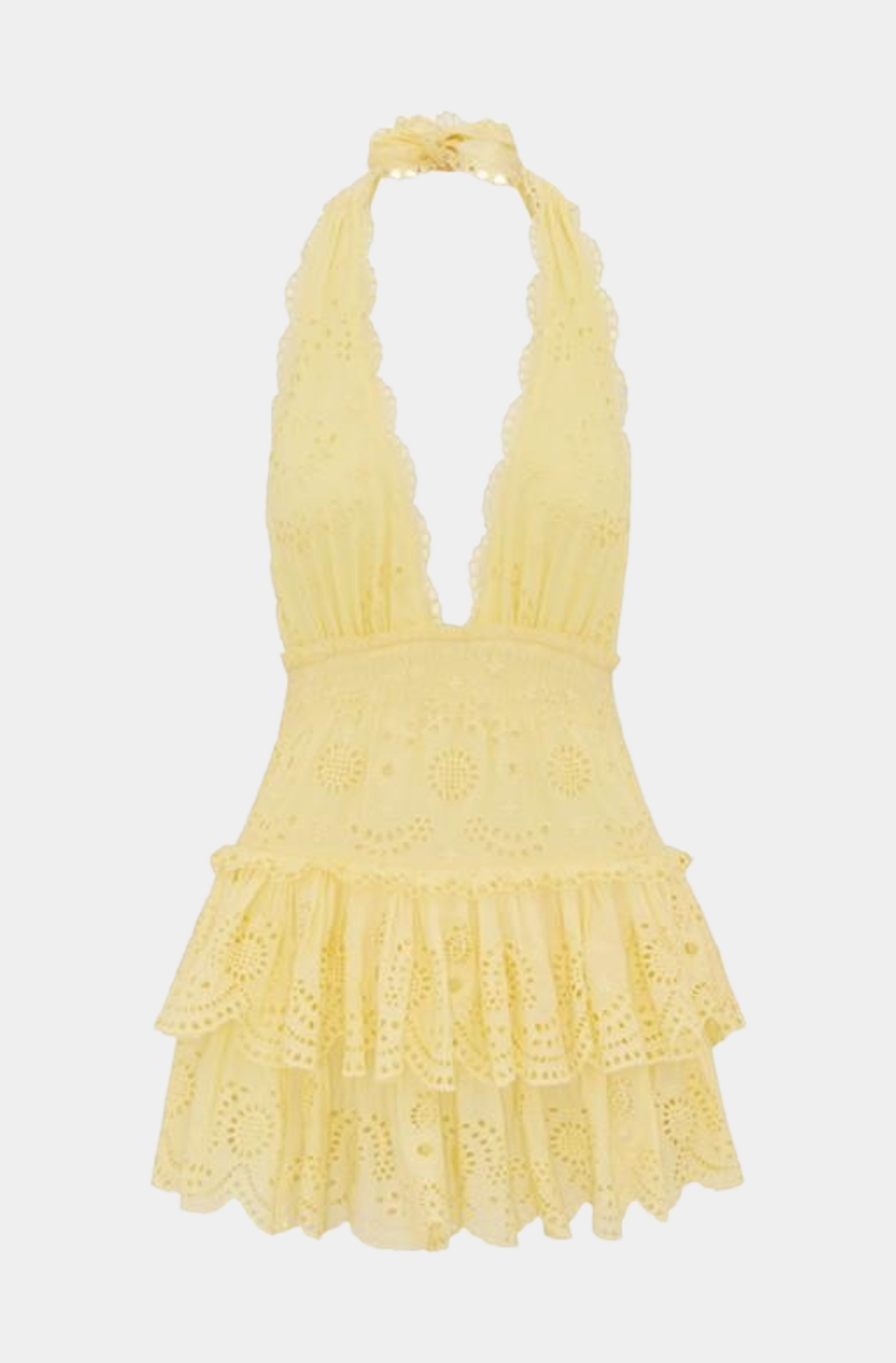 Elevate your fashion game with the Janea Dress. This mini dress features a chic halter neck design and a tiered ruffle skirt, offering a flattering silhouette for any occasion. Crafted from organic cotton, the eyelet detailing adds a touch of sophistication and breathability, making it ideal for warm weather. Perfect for summer outings or special events.