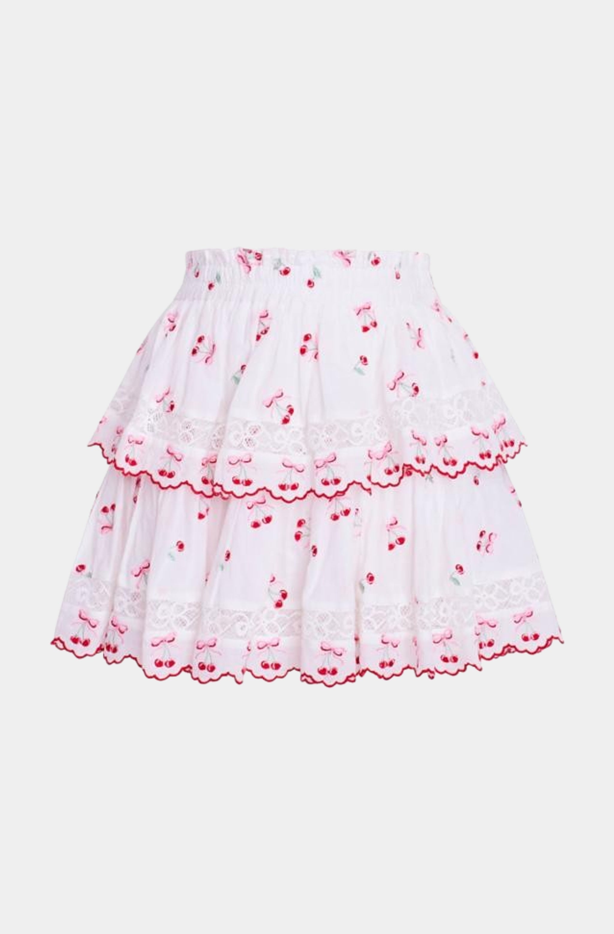 This skirt features delicate embroidery and playful ruffles, offering a touch of elegance and femininity. Its crisp white hue makes it versatile for pairing with various tops, while the flattering silhouette ensures a comfortable fit. Ideal for both casual outings and dressier events, this skirt is a must-have for those who appreciate style and sophistication.